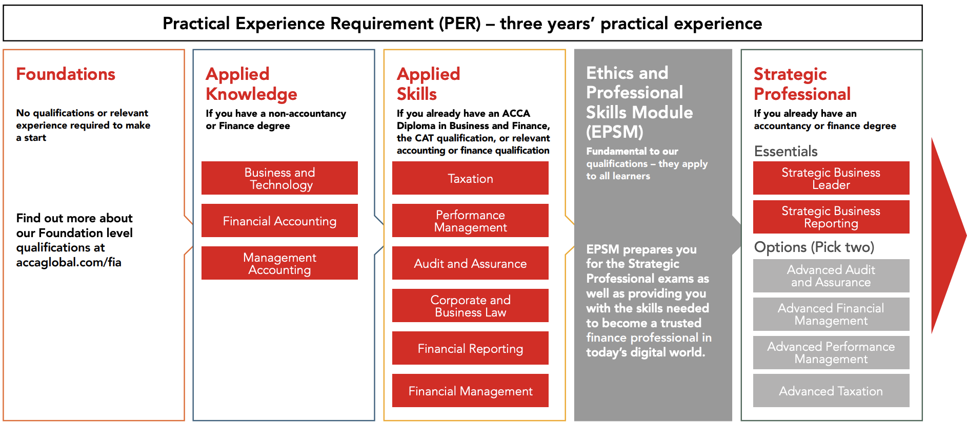 The ACCA Qualification has three stages of Exams, plus an Ethics and Professional Skills module and Professional Experience Requirement.